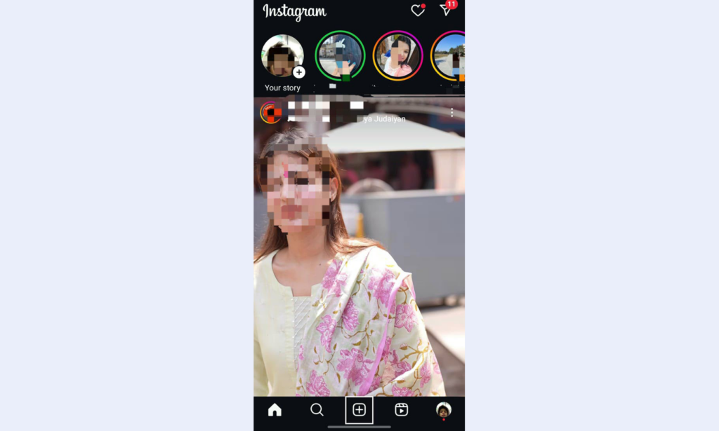 Step 2 – Open your Instagram account on your mobile phone and click the “+” icon in the middle of the downside of your Instagram interface, or you can do it by left-swiping on your mobile screen.